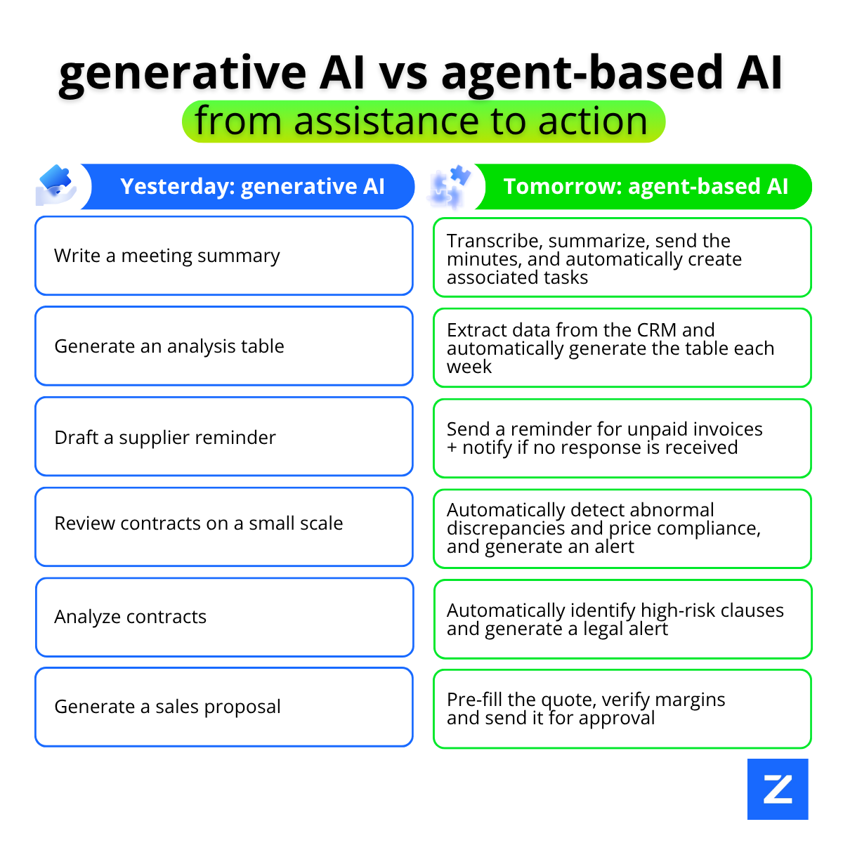 But this power has a fundamental limit: generative AI acts on instruction. It responds to a prompt, proposes a solution, generates a summary – but it’s the human who decides, validates and executes. In a context where purchasing departments have to process increasing volumes of supplier documents (quotations, BPU, DPGF, invoices, framework contracts), this conversational model is showing its operational limits.